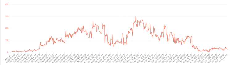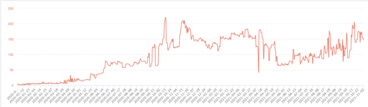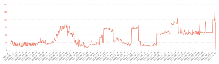 海外收入第一的《State of Survival》在美国大有“深藏功与名”的姿态,2021年2月出现投放高峰后,投放量持续走低。今年7月开始已低至日均50组的水平,即使在节假日密集的10月11月也没有上升趋势。