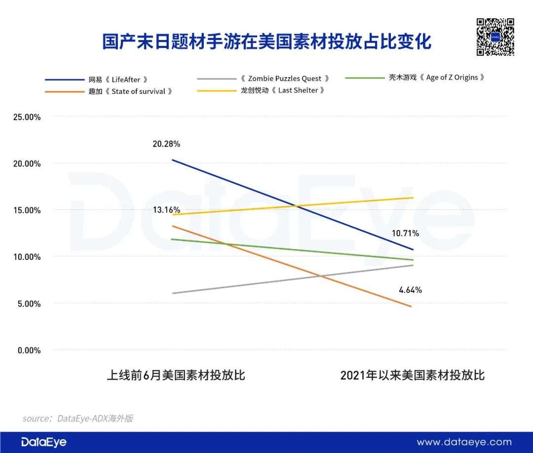 进一步从时间维度上统计,可以发现,除了《Zombie Puzzles Quest》和《Last Shelter》在美素材投放占比略有上升之外,其它几款国产末日题材手游投入占比总体下降,其中,趣加的《State of survival》下跌了8.52%,而网易的《LifeAfter》则大跌9.57%。