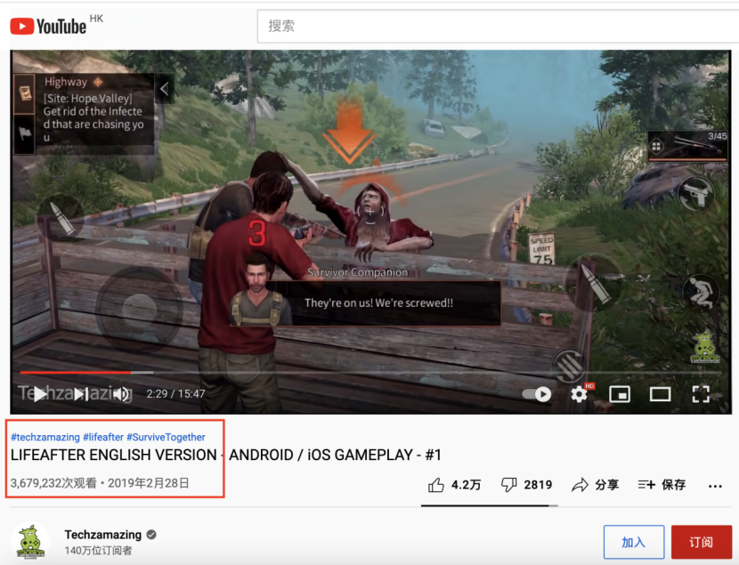 从Facebook、Twitter、YouTube等平台来看,各手游播放量最高的内容,主要来自KOL或玩家的测评/体验视频。例如,2019年2月28日网易《LifeAfter》刚上线不久,拥有140万订阅的YouTube大V“Techzamazing”发布的游戏视频观看量高达367万。