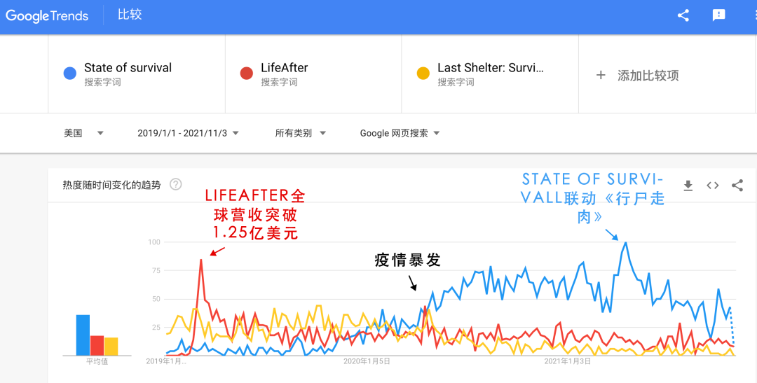 从谷歌趋势对比来看,三款典型的国产末日题材手游,在美国搜索热度分化严重: