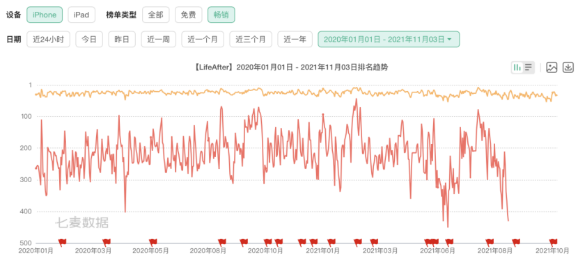 《LifeAfter》在“游戏-冒险(畅销)”榜排名稳定,但在“游戏(畅销)”总榜波动下滑