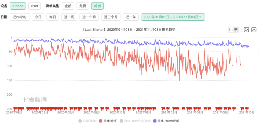 《Last Shelter》在“游戏-策略(畅销)”榜排名稳定,但在“游戏(畅销)”总榜波动下滑