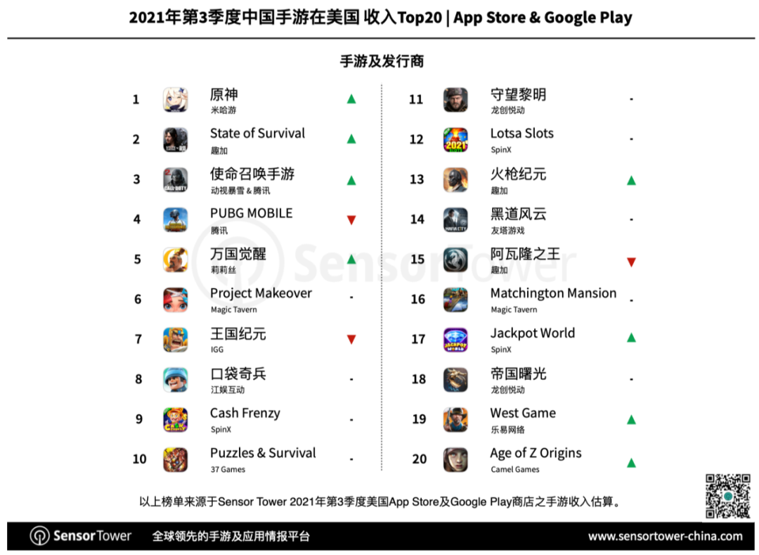 让人惊讶的是,目前,虽然最经典的末日影视作品来自美国,但最受欢迎的末日手游却出自中国——2021上半年,全球收入最高的5款末日题材手游,无一例外,均由中国团队研发!第三季度中国手游在美收入Top20,也有不少末日题材手游的身影。