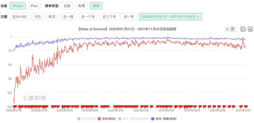 如此佛系,下载量如何?七麦数据显示,在iPhone端,2020年以来,虽然国产末日题材手游在美国的游戏总榜下载排名,波动较大,有涨有跌,但在各自的细分游戏领域,却表现异常稳定!