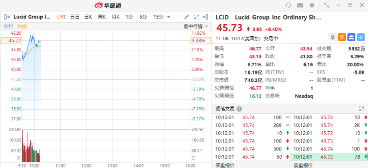 华盛资讯11月8日讯,美股早盘,美股新能源车板块集体拉升,Lucid Group(LCID)涨超9%,Nikola(NKLA)涨6%,Lordstown Motors(RIDE)涨4.64%,福特汽车(F)、Fisker(FSR)、通用汽车(GM)涨超3%。