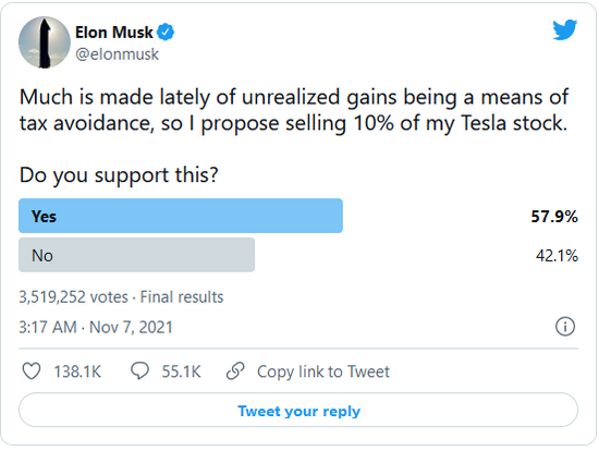 在上周六发布的一项推特民意调查中,世界首富——特斯拉CEO马斯克表示:“最近有很多“未实现收益”都是一种避税手段,所以我建议出售10%的特斯拉股票。你支持吗?”这位亿万富翁给了人们投“是”或“否”的选择,并承诺无论结果如何都会遵守。351.92万人参与了投票,其中57.9%的人投了赞成票。