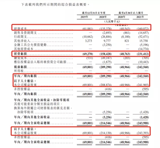 根据财报,公司在2019年、2020年及2020年上半年及2021年上半年,分别录得亏损净额人民币6980.1万元、2.09亿元、4896.6万元及2.43亿元,主要由于公司的研发成本及行政开支所致。