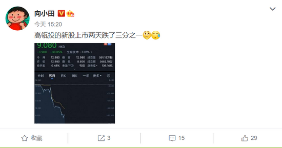 与此构成鲜明对比的是,高瓴最为单一最大机构股东的三叶草生物3日暴跌逾30%,知名财经大V向小田昨日发文感慨,“高瓴的新股上市两天跌了三分之一”。