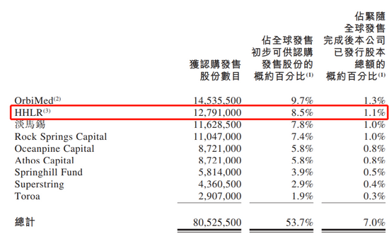 微创机器人是次IPO引入 7名基石投资者,其中高瓴资本认购1500万美元、Aspex认购2000万美元、礼来认购1500万美元、雪湖资本认购1500万美元、Yorkool认购1500万美元、科技基金CloudAlpha认购1000万美元、Artisan认购500万美元,合共认购 9500万美元的发售股份。