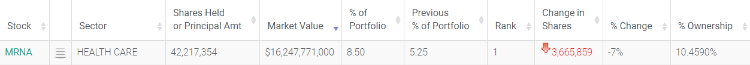 据13F文件,三季度该机构第一大持仓股为抗疫概念股Moderna $MRNA ,持仓数约为42217354股,市值约162.47亿美元,占投资组合的比重为8.5%,此前为5.25%。Baillie Gifford实际于三季度减持了366.5万股Moderna,只是在此期间该股涨幅较大,所以在持仓组合中的占比有所上升。