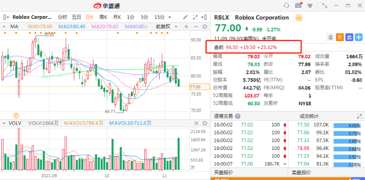 华盛资讯11月9日消息,今日美股盘前,元宇宙第一股Roblox(RBLX)大涨超25%,最新财报显示,公司第三季度营收同比增长102%,日活用户数同比增长31%。