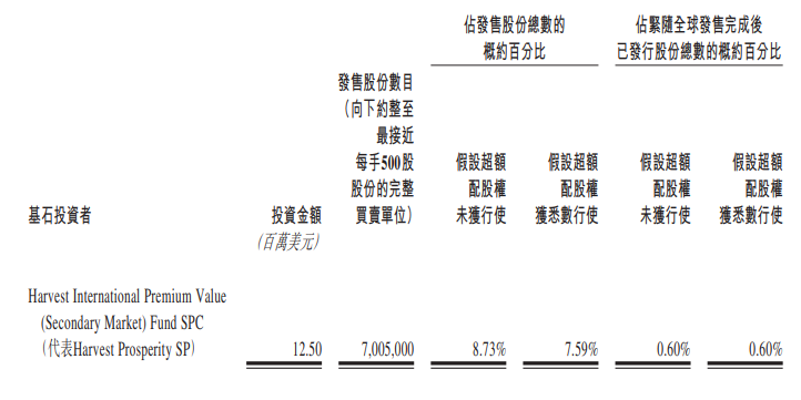 根据发售价每股发售股份13.88港元及基石投资协议,具体基石投资者获配股份如下图: