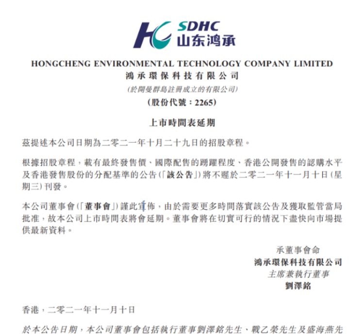 另一只新股鸿承环保科技最新公告表示延迟上市,本公司董事会(「董事会」)谨此宣布,由于需要更多时间落实该公告及获取监管当局 批准,故本公司上市时间表将会延期。董事会将在切实可行的情况下尽快向市场提供最新资料。