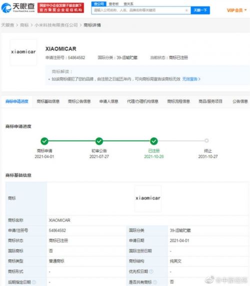 小米造车再获新进展,近日小米汽车多个商标获批。