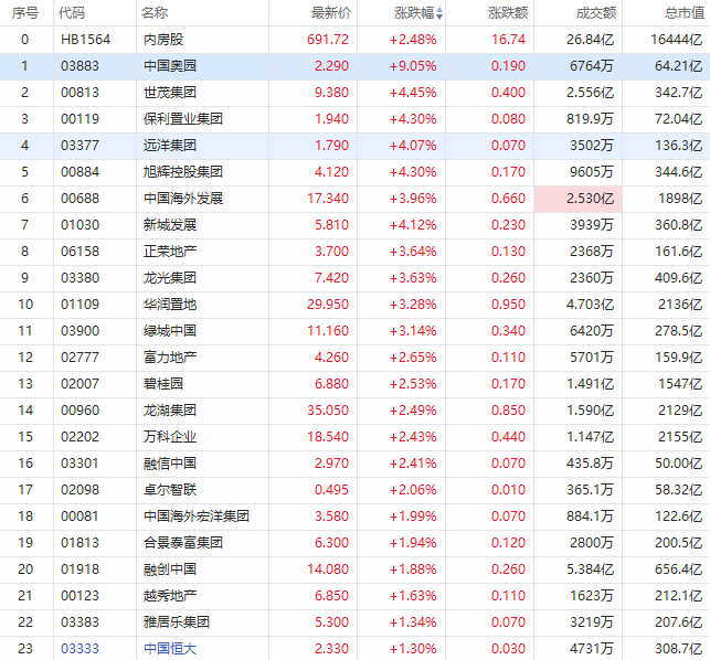 华盛资讯11月10日消息,内房股午后集体回暖。截至发稿,中国奥园涨9.05%;世茂集团涨4.45%;保利置业、旭辉控股、新城发展涨超4%;华润置地涨3.28%,报29.95港元每股,成交额4.7亿港元;富力地产、万科企业、碧桂园等涨逾2%;中国恒大涨1.3%;融创中国跟涨。