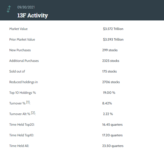 全球最大资管公司贝莱德公布其第三季度13F文件。截至2021年9月30日总持仓市值达3.572万亿美元,上一季度总市值为3.593万亿美元,环比下降0.58%。