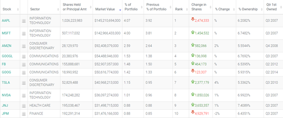 第四和第五分别为谷歌母公司Alphabet $GOOGL 和Meta $FB ,持仓市值分别约544.9亿美元和529.1亿美元。