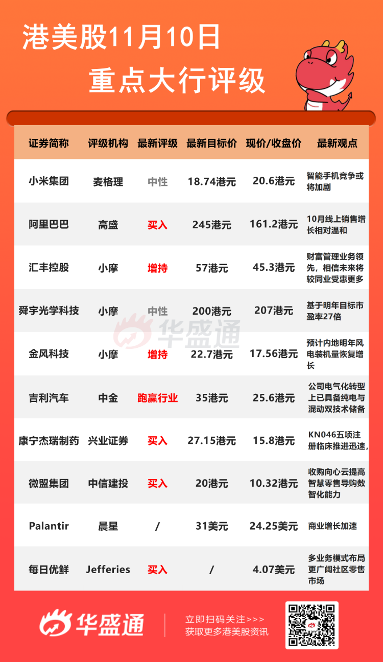 麦格理发布研究报告,将小米目标价由36.7港元下调48.9%至18.74港元,主要基于其中国市占率损失等因素;另因荣耀手机市场反弹,评级由“跑赢大市”降至“中性”,并认为智能手机竞争或将加剧。此外,该行将公司今年非国际财务报告准则纯利预测调高6%,主因较佳的智能手机利润,但因较差的手机、物联网、网络服务前景,调低未来两年纯利预测4%/7%。