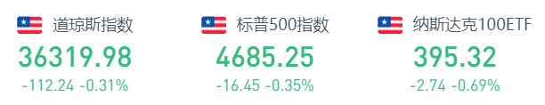 周二美股三大指数收跌,道指跌0.31%,报36319.98点;标普500指数跌0.35%,报4685.25;纳指跌0.60%,报15886.54点。