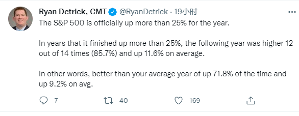 今年迄今,标普500指数已经累计上涨逾25%。美国投顾机构LPL Financial的首席市场策略师瑞安•德特里克(Ryan Detrick)指出,历史上,在标普500指数涨幅超过25%年份的后一年,该指数的平均涨幅为11.6%。在过去14次这样的情形中,标普500指数第二年上涨的次数达到12次,上涨几率高达85.7%。
