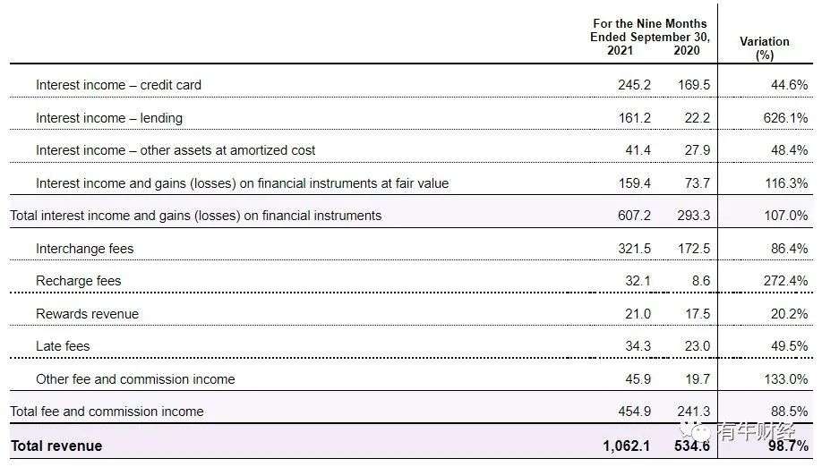 这其中,“金融工具的利息收入和收益”一项收入占到了Nubank总营收的大头,这包括了Nubank的信用卡业务(信用卡循环余额)、贷款利息收入等,三年来收入数据分别为1.62亿美元、3.38亿美元和3.83亿美元,占营收比重分别为50.7%、55.2%和51.9%。今年上半年(截至9月30日),这一收入达到6.07亿美元,同比增长107%。