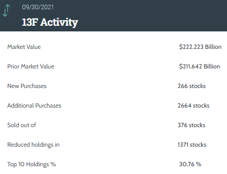 据统计,巴克莱三季度持仓总市值达2222.23亿美元,上一季度总市值为2116.42亿美元。该机构在三季度的持仓组合中新增了266只个股,增持了2664只个股;减持了376只个股,清仓了1371只个股。其中前十大持仓标的占总市值的30.76%。
