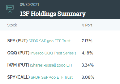 截至第三季度,巴克莱的前五大持仓股为标普500指数ETF $SPY 看跌期权,纳斯达克100 ETF $QQQ 看跌期权、罗素2000指数ETF $IWM 看跌期权、标普500指数ETF $SPY 看涨期权以及苹果 $AAPL 。