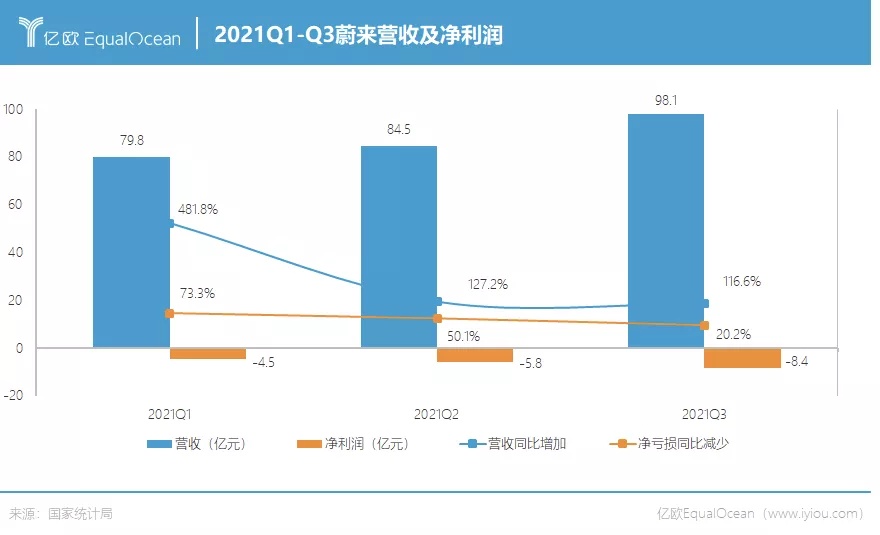 2021年11月10日,蔚来发布三季度财报,三季度营收达98.1亿元,同比增长116.6%,现金储备达470亿元。