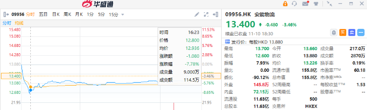 华盛资讯11月10日讯,货运物流企业安能物流 $09956.HK 暗盘低开1.59%,尾盘收跌3.46%,一手账面浮亏240港元,最新总市值超155亿港元。该股预计将于明日(11.11)正式上市。