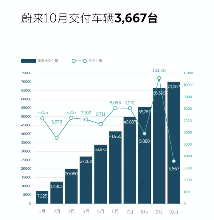 第三季度交付量,蔚来落后于小鹏、理想,紧接着在10月,蔚来交付量只有3667辆。
