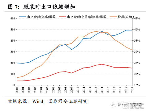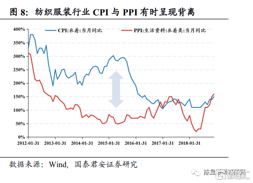 除此之外,由于大宗商品当中大多数均为来自于海外定价,来自于海外市场的因素同样会使得传导机制的效率出现降低。其中2014-2015年PPI持续下行的一项重要原因来源于页岩油产量上升叠加地缘政治等多种原因导致的原油价格大幅度下跌。拆分CPI分项来看,可以明显看出出口占比较高的纺织服装行业CPI-PPI传导的相关度较低,而相对于其他的国内定价权较高的消费品行业传导力度较强。随着我国服装出口在全球份额的增加,服装纺织对出口依赖加深,使PPI当中有较大一部分来源于海外因素,与此同时国内外定价分化,PPI出现波动,但国内CPI较为平稳,与PPI呈现分离。