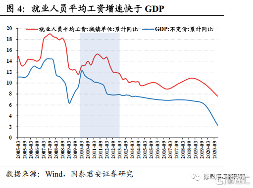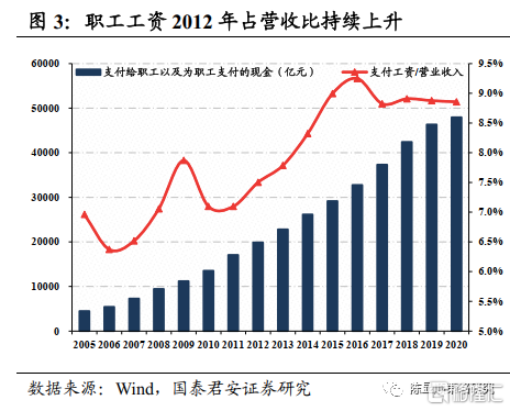 拆分2012年来PPI与CPI背离的原因,我们认为主要可归结为三点:其一,随着我国经济跨过刘易斯拐点,劳动力成本开始出现明显提升,由此带来原材料成本占比降低。其二,外在的政策等因素对于上游价格扰动,如供给侧改革、限价措施等,由此带来价格产生一定的扭曲除此之外,来自于海外市场因素对于PPI扰动力度强于CPI,由此使得CPI与PPI之间的传导机制出现弱化。其三,由于此前中游行业议价能力相对较弱,且集中度分散,2012年后我国资本开支持续下滑,中游承担了较多的成本压力,由此对于传导效应产生一定“阻断效应”,而本轮中游竞争格局的出清基本完成。2011年后劳动力成本所占比例出现了较为明显地上升,意味着刘易斯拐点的到来,由此使得CPI持续高于PPI。从支付工资/营业收入这一指标来看,自2011年开始呈现出持续上行的趋势,由此前的6.37%上升至最高达到9.25%的水平,而从就业人员平均工资水平累计,自2011年开始其明显与GDP同比产生背离,即工资的涨幅高于经济总量的上升幅度,由此带来CPI的同比数据持续高于PPI。