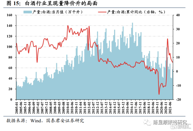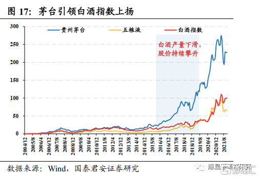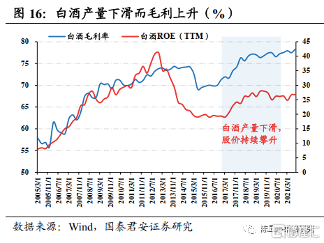白酒行业自2016年开始整体呈现出产量下滑而价格上涨的格局,全行业的提价使得整体行业的毛利率迅速提升。自2015年以来,白酒可谓是A股市场表现最为亮眼的板块之一,很大程度上得益于竞争格局改善背景下龙头企业的不断提价。从白酒的产量与消费量上来看,2013年后白酒产量同比明显降速,直至2017年后甚至出现了产量同比下滑。但伴随产量下滑的同时,上市企业的毛利率的ROE水平呈现出持续提升的趋势,由2015年的69%提升至2020年的77%,对应到行情表现来看,茅台引领白酒指数自2015年以来呈现出持续上涨的趋势,走出了一轮亮眼的白酒行情。