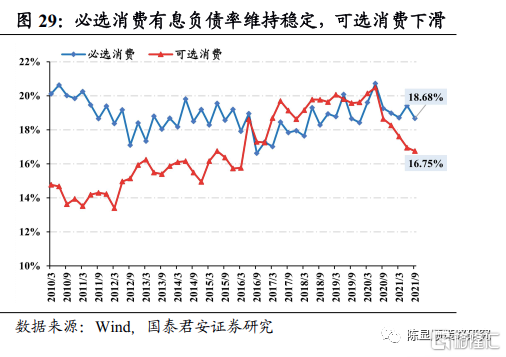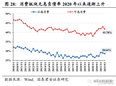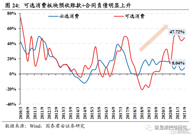 从预收账款+合同负债同比来看,消费板块呈现出明显的同比上升趋势。与地产行业的有所差异,消费行业预收账款代表着一家企业的先收款后发货的能力,如贵州茅台、五粮液等一线白酒企业的预收账款占营收的比重均可高达20%左右,代表其先收款后发货的能力较强。从消费板块的该指标来看,可选消费自2019年以来同比增幅持续上升,至2021Q3同比增幅达到47.72%,而必选消费则相对保持较为稳定的增幅。