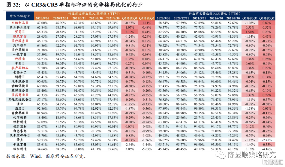 针对这一指标,由于三级行业存在较明显地失真现象,因此本文仅计算精确到二级行业行业格局变化,从最近的CR3/CR5指标变动来看,较为值得关注的细分行业主要为生物制品、贸易、服装家纺、医疗服务、种植业、农产品加工、医药商业等。