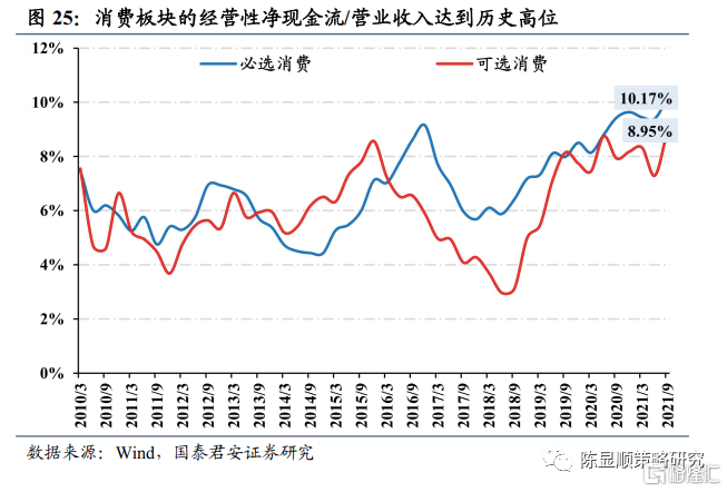 从经营性净现金流/营业收入的指标变动来看,消费板块同样呈现出持续的上升趋势。经营性净现金流/营业收入给予的启示在于公司可以通过更强的市场竞争地位,进而收回更多的现金流。因此这一指标的改善同样也能侧面印证行业的竞争格局的优化,从这一指标来看,必选消费与可选消费板块自2015-2016年出现了一轮拉升,此后自2019年以来持续上扬,至2021Q3必选消费经营性净现金流/营业收入占比达到10.17%,可选消费该指标达到8.95%,均位于历史高位,因此从这一指标上同样可以看出消费板块的集中度上升的趋势。