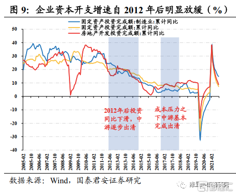 2012年以前,我国经济整体处于需求驱动的“增量经济时代”,PPI-CPI的传递机制相对顺畅,其中2007-2008年的通胀主要由于全球经济景气背景下需求端的拉动,原油价格一度突破130美元/桶,由此CPI先于PPI向上抬升,于2008年年中PPI与CPI同比均达到接近10%的高点,随后金融危机席卷全球,进入衰退阶段。而2009-2010年的通胀周期主要为财政货币发力刺激的情况下,我国经济迎来了一轮强复苏,而本轮PPI率先上升,CPI滞后于PPI大约2-3个月出现抬升。