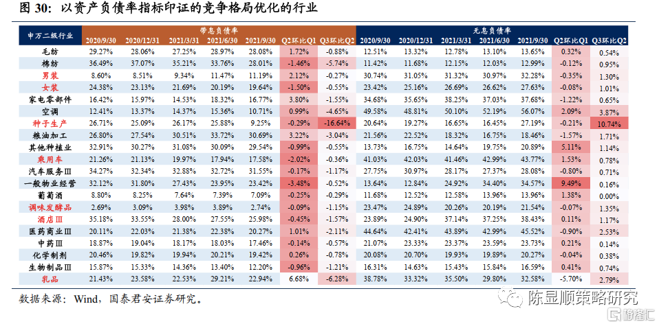 同样基于上述的线索,本文对于消费细分行业当中资产负债率的结构进行筛选,选取无息负债率上升而有息负债率下行的细分行业:纺织服装(男装女装)、种植业、乘用车、调味品、乳制品等。