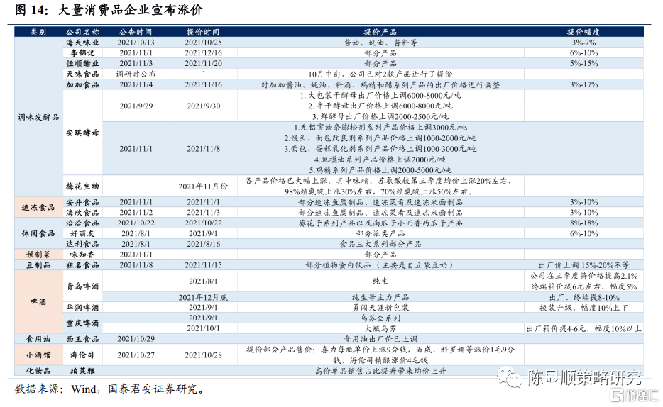 经历了2016年的来的供给侧改革、去杠杆以及2020年的疫情冲击,许多下游的消费行业集中度得到明显提升,其相对于上下游的议价权得到了同步提升。基于这一条逻辑,我们看到近期以来许多消费品公司已经展开了一轮提价的进程,如海天味业、安琪酵母、恒顺醋业等公司均在原材料成本上涨的压力之下实现提价,而近期我们可以看到越来越多的消费品企业加入到了提价的阵营当中,如果这一类型企业提价趋势得以延续,PPI至CPI的传导效果将更为迅速顺畅。