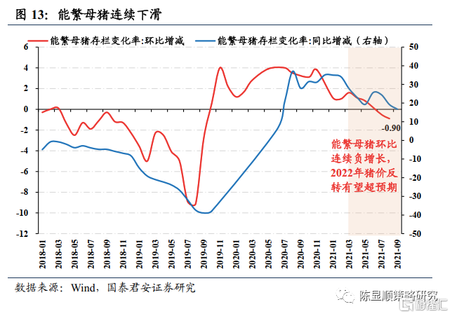 能繁母猪连续环比下滑预示着猪肉价格开始出现寻底。2021年当中CPI一项重要的拖累因素在于供给释放之后猪肉价格大幅下滑。而自2021年7月开始,能繁母猪存栏环比开始出现连续下滑,其中8月下滑幅度为-0.9%,而除此之外,经过了猪瘟的“洗礼”,养殖行业竞争格局出现明显改善,。展望明年,猪肉价格的回暖是推升CPI回升的一项重要因素。