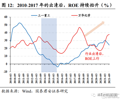 在此背景之下,机械制造以工程机械为代表、加工制造以部分化工品为代表的投资机会在2016-2017年逐步展现,背后的投资逻辑即体现了行业竞争格局的改善。从股价的走势来看,尽管需求端的增量不如2009-2010年显著,但三一重工和万华化学自2016年来股价持续上涨,最高累计涨跌幅一度逼近10倍,对应到ROE的变化来看,2011-2016年为中游制造行业的出清阶段,体现为ROE水平的不断下滑,而从2017年初开始,三一重工、万华化学等中游企业盈利能力迅速扭转,其对应的即典型的竞争格局改善带来的ROE提升,而中游行业完成竞争格局的优化后,下游消费行业也正在经历这一过程。