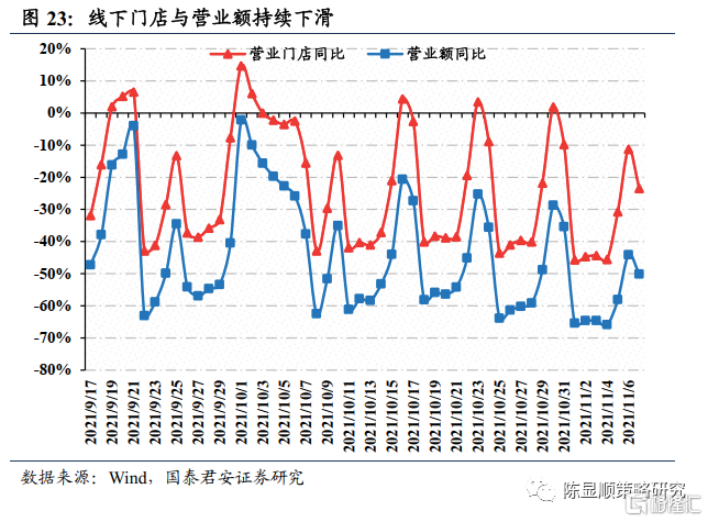 除了食品饮料行业之外,在休闲服务、商贸零售等行业,2020疫情带来的供给冲击对于许多中小商铺带来了极大“损伤”。根据美味不用等数据,2021年来营业门店同比相较于2020年呈现持续下滑,因此线下服务层面同样呈现供给侧出清的逻辑,尽管受到散发疫情等因素的压制,整体消费的景气度仍然处在低位,但竞争格局的改善正在持续演绎的过程之中,一旦出现边际上的回暖,则修复力度将远超预期。