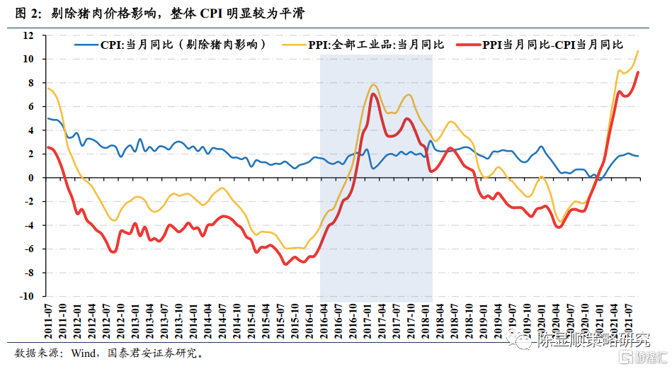 考虑到猪肉的周期性波动对于CPI的影响较大,且2013年之后猪肉价格的波动与经济周期出现明显错位,本文剔除猪肉的贡献考察PPI-CPI之间的传导。采用CPI当月同比减去统计局公布的猪肉贡献项作为剔除猪肉对CPI的扰动因素后的CPI指标,从这一指标与PPI的关联来看,2019年的波动整体被压平,但我们同样观察到了2012年来CPI持续高于PPI以及2016-2017年CPI并未随着PPI的上行而持续攀升。本轮PPI上行的背景下剔除猪肉价格影响下的CPI同比2021年9月达到1.82%,已开始出现较小幅度上升,但整体传导力度仍然偏弱。