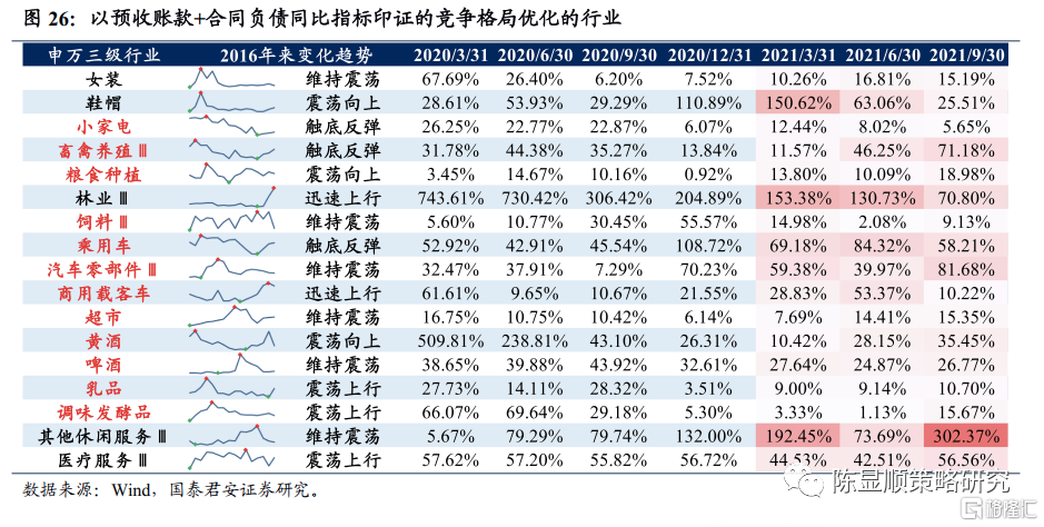 因此,基于上述的两条特征,本文对于消费细分行业进行筛选,从结果上来看,近期以来符合预收账款+合同负债同比增速上行以及经营性净现金流/营业收入比例上行的指标,且相对行业逻辑顺畅的细分行业主要为:小家电、汽车(乘用车、汽车零部件)、农林牧渔(畜禽养殖、粮食种植、饲料)、食品饮料(白酒、黄酒、啤酒、乳制品、调味品)、纺织服装及酒店等。
