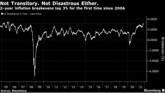 通胀预期则有所上升,两年盈亏平衡通胀率上升到3%以上,自2006年以来达到最高。虽然这不算灾难,但这样的趋势表明,美联储将在未来几年减少花在压低通胀上的精力。