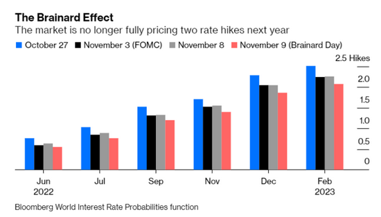 周一的市场依然100%押注明年两次加息25个基点,但周二消息人士透露拜登与布雷纳德进行面谈后,市场押注只有一次25个基点的加息。明年11月(中期选举前一周)加息的可能性已降至50%以下。