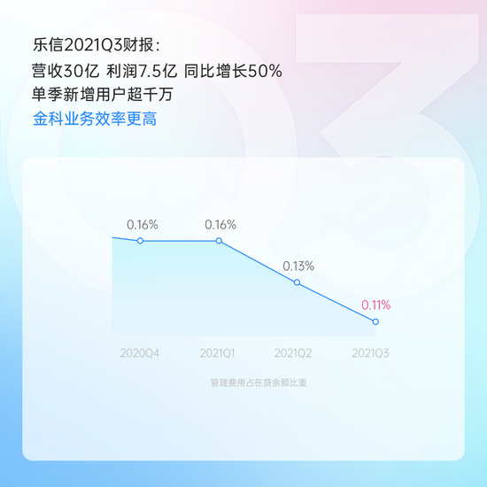 北京时间11月11日,中国领先的新消费数字科技服务商乐信(NASDAQ:LX)发布2021年3季度未经审计财务业绩。得益于结构调整及精细化运营能力提升,3季度,乐信营收30亿元(人民币,下同),息税前利润7.5亿(Non—GAAP),同比增长50%。规模稳健增长的同时,资产质量保持稳定,90天以上的逾期率1.85%,新增资产的结构更优;经营效率持续提升,管理费用占在贷余额比重为近年最低。