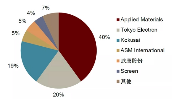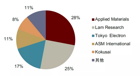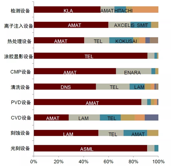 其中,Applied Materials被业界誉为“半导体设备超市”,其产品服务覆盖领域包括等离子体刻蚀、单晶圆热处理、化学气相薄膜沉积、物理气相薄膜沉积、外延薄膜沉积、离子注入、检测等;ASML专攻光刻设备,通过多年的研发与技术积累,在光刻设备这一细分市场已经形成主导地位;Lam Research、Tokyo Electron和KLA-Tencor也不断丰富拓展其产品线,在等离子体刻蚀、薄膜沉积、热处理、清洗、显影、检测等领域拥有较为成熟的产品。