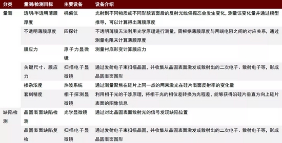 ► 量测类设备:主要用来测量薄膜厚度、关键尺寸、套准精度、膜应力、掺杂浓度等指标以确保产品参数符合设计要求,对应的设备有椭圆偏振光谱仪、四探针、原子力显微镜(AFM)、扫描电子显微镜(SEM)、热波系统、相干探测显微镜等。