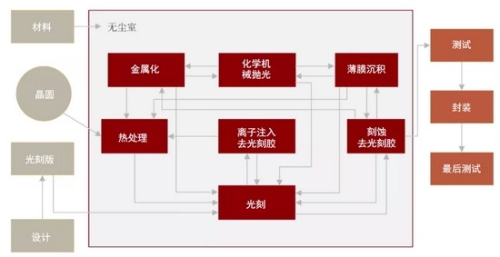 芯片制造可分为硅片生产、前道工艺(晶圆制造)、后道工艺(封装测试)等步骤。其中,前道工艺是最为复杂步骤,前道工艺制造先进集成电路器件的过程如同建造一个几十层的微观楼房,需要一层一层建造微观结构,举例来看,若要建立60层的复杂结构,需要约1,000个加工步骤,涉及光刻、刻蚀、薄膜沉积、清洗、化学机械抛光、涂胶显影、热处理、离子注入、检测等不同的工序。